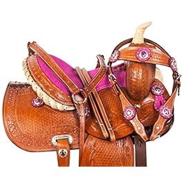 We have saddles with different colors, elements, and even ornaments. Girls can choose a saddle with pink details. There is also a beautiful saddle King Series Jr. Plainsman in cherry blossom with floral decoration. This western saddle includes a lot of leather tooling, silver conchos, and studs.