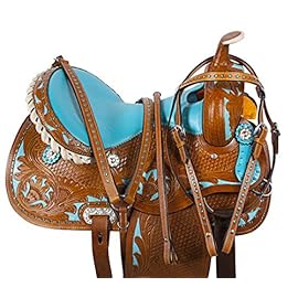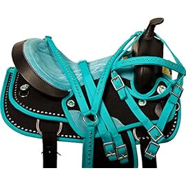 Miniature Horse Leather Saddle is a saddle made from natural leather and has a suede seat. This adorable saddle features turquoise blue crystal rhinestones, bordering the skirt and the cantle, that match the well-padded turquoise blue suede seat. The medium oil leather is hand carved throughout with floral and basket weave tooling that give the saddle a classic look for your little rider. The design is finished with Texas star conchos, as well as a rawhide wrapped horn, cantle trim, and stirrups. The underside is well-padded with fleece for optimum comfort throughout the ride. Acerugs saddles leave a vivid impression. They are attractive, have bright accents in design and an unusual, delightful embossing.